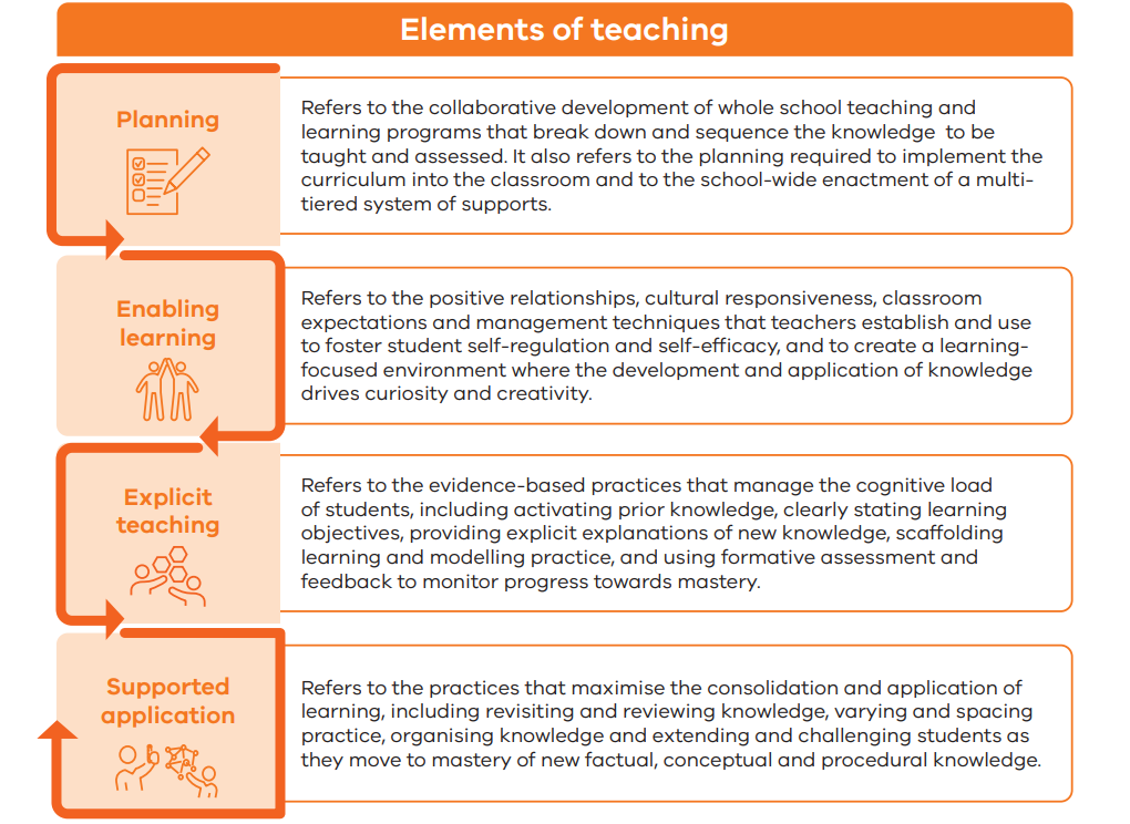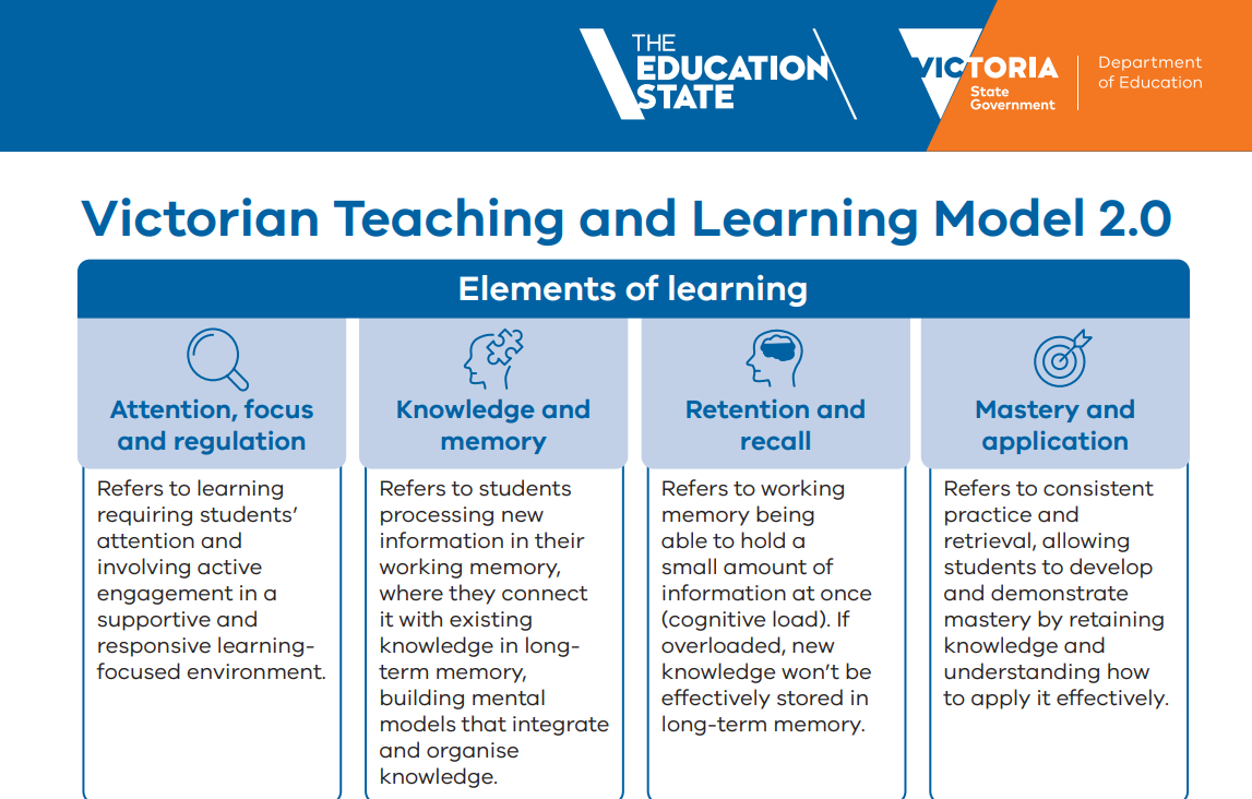 Heathcote Primary School uses the Department of Education's updated Victorian Teaching and Learning Model (VTLM 2.0) to maximise learning opportunities and support all students to succeed. The model is an evidence based framework which incorporates how students learn best and teachers teach most effectively. It is a teaching and learning model that can be applied accross curriculum areas.
